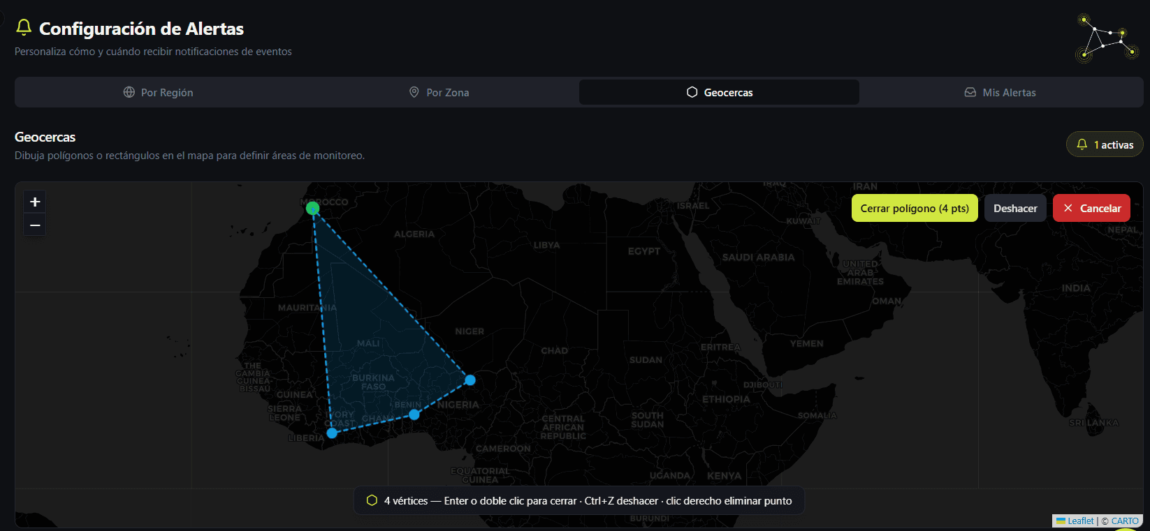 Configura alertas por geofencing o por zonas de riesgo. Recibe solo las alertas que te importan mediante filtros avanzados.